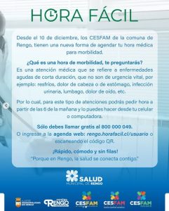 2. 💻 Agenda Web: Ingresa al link directo www.rengo.horafacil.cl/usuario (o escanea el QR de la gráfica). Ambas plataformas estarán disponibles desde el 10 de diciembre 2025, desde las 6:00 AM.